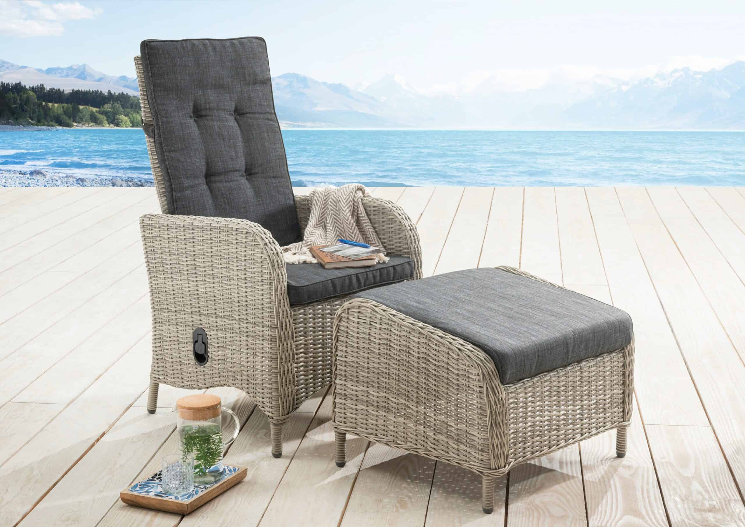Ein Gartenmöbelset, das dir Entspannung und Komfort bietet, erhältst du mit dem Relaxsessel »Palma HL/Casa« von Destiny. Das Möbelstück für den Außenbereich auf der Terrasse oder dem Balkon kommt mit einem praktischen Fußhocker. Damit entsteht ein Ort zum Wohlfühlen für dich alleine. Das Ambiente deines Gartens ist die ideale Kulisse dafür. Durch das zeitlose Design lässt sich der Gartensessel einfach zu schon vorhanden Loungemöbel kombinieren. Er besteht aus einem langlebigen Aluminiumgestell, um das sich wetterbeständiges Polyrattan in Flecht-Optik legt. Die weichen Sitzpolster sind bequem und kommen mit abnehmbarem Bezug. Und wie legst du dich entspannt in Relax-Position, um den Feierabend bei einem guten Buch im Sonnenschein zu genießen? Du benötigst nur wenige Handgriffe, um die Rückenlehne mittels Gasdruckfeder stufenlos zu verstellen. Jetzt heißt es für dich, leg die Füße hoch und lass den Komfort des Destiny Relaxsessels »Palma HL/Casa« auf dich wirken.