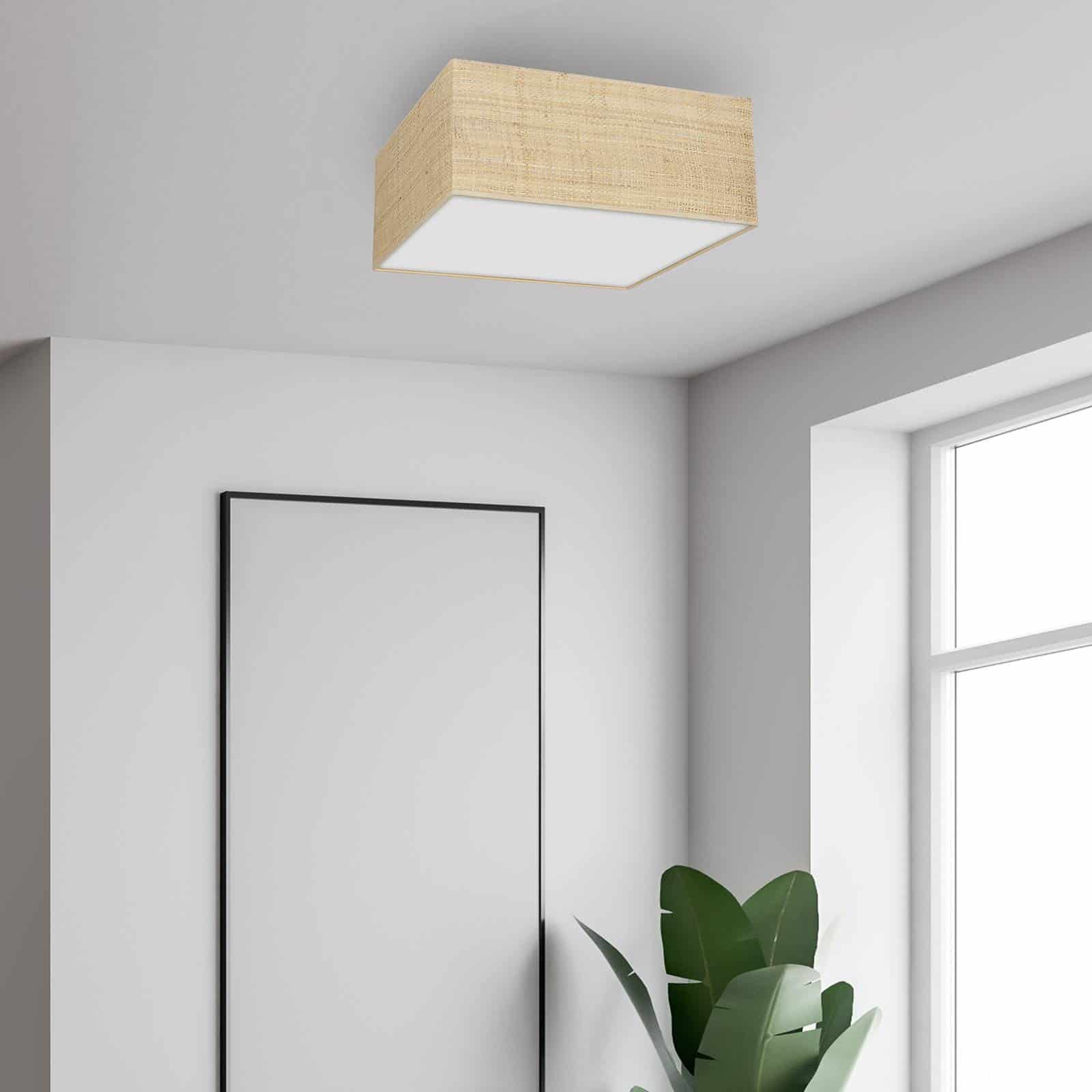Der quadratische Schirm der Deckenleuchte Leano ist mit einem Rattangeflecht umzogen und verleiht der Einrichtung ein natürliches Flair. Der Diffusor sorgt für einen sanften und gleichmäßigen Lichtaustritt. Die Leuchtmittel sind nicht fest verbaut und daher frei wählbar. Artikelnummer: 3076161Hersteller: EulunaMaterial: Metall, RattanFarbe: beige, weißLänge: 50 cmBreite: 50 cmHöhe: 13 cmLeuchtmittel inklusive: NeinFassung: E27Leuchtmittel: 3 x 60 WDimmbar: JaSchutzklasse: ILeistungsaufnahme: 60Keywords: Deckenlampe, Lampe