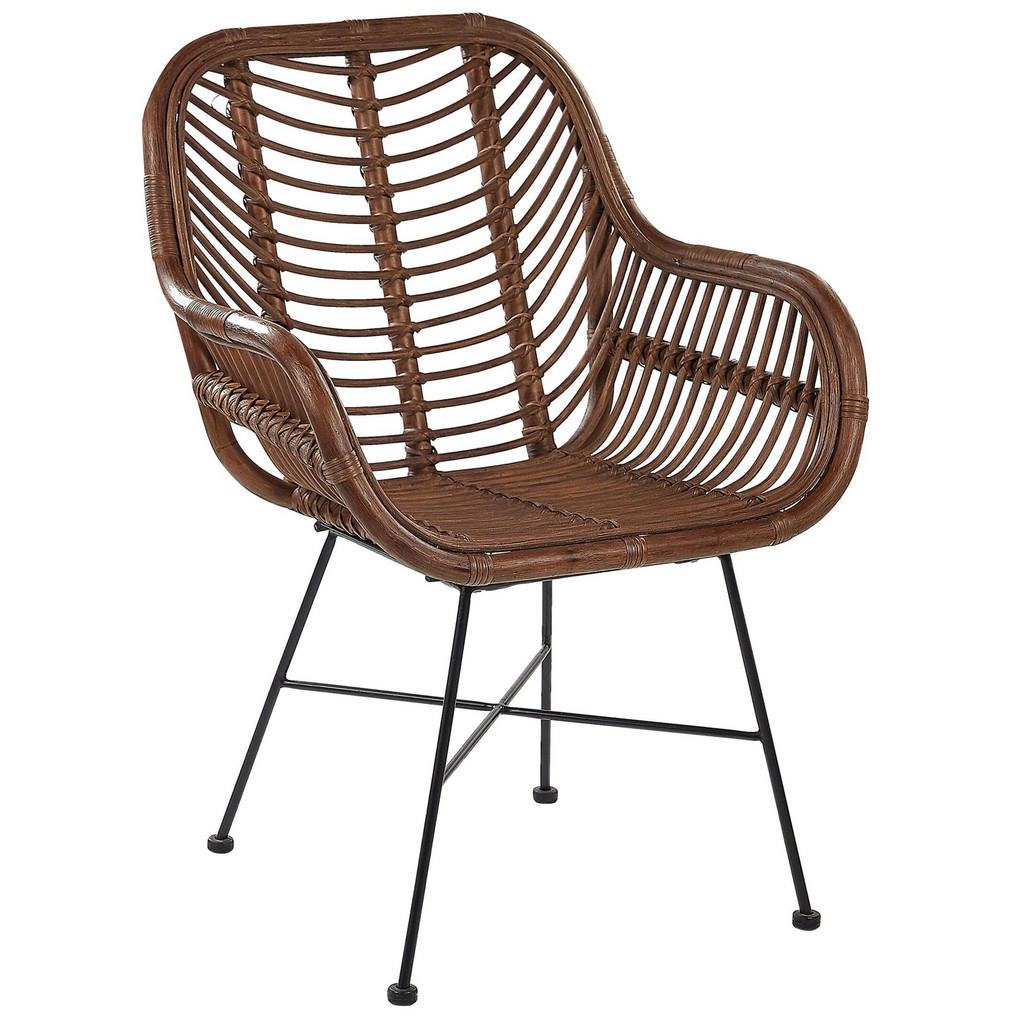 Formschöner Stuhl aus Rattan. Mit diesem Stuhl kommt gute Laune auf! Die formschön geschwungene Sitzschale ist aus robustem Rattan in einem braunen Farbton gefertigt und verfügt über eine luftige, offene Struktur. Das schlanke Metallgestell in Schwarz sorgt für Stabilität und verleiht eine elegante Note. Details: Typ: Esszimmerstuhl Stil: Modern Farbe: Braun Gestellfarbe: Braun Material Typ: Rattan Material: Rattan Zusätzliches Material: Metall Gestellmaterial: Metall Sitzmaterial: Rattan Armlehnen: Ja Finish: Matt Stapelbar: Nein Abmessungen: Höhe Armlehnen: 64 cm Tiefe: 51 cm Sitzhöhe: 44 cm Breite: 64 cm Höhe: 89 cm Sitzfläche: 41x40 cm Gewicht: 5 kg Max. Belastung: 120 kg Sie kaufen: 1 x Stuhl Produktvorteile: Handgefertigte Präzision, Gemütliche Ausstrahlung, Schutzkappen zum Schutz des Bodens, Breite, bequeme Sitzfläche, Bequem geformte Armlehnen Montage: Beine / Füsse nicht montiert. 5 - 15 Min. Pflegehinweise: Rattan: 1. Die Reinigung sollte ausschließlich mit einem weichen, trockenen Tuch und ohne Reinigungsmittel erfolgen. Metall: 1. Bitte ausschließlich handelsübliche, milde Reinigungsmittel und weiche Tücher verwenden, wobei feuchte Stellen sofort trocken gerieben werden sollten. 2. Vermeiden Sie scheuernde Reiniger, da diese die Oberfläche beschädigen können. 3. Bei Chrom und Kupfer regelmäßig mit speziellen Pflegemitteln polieren.