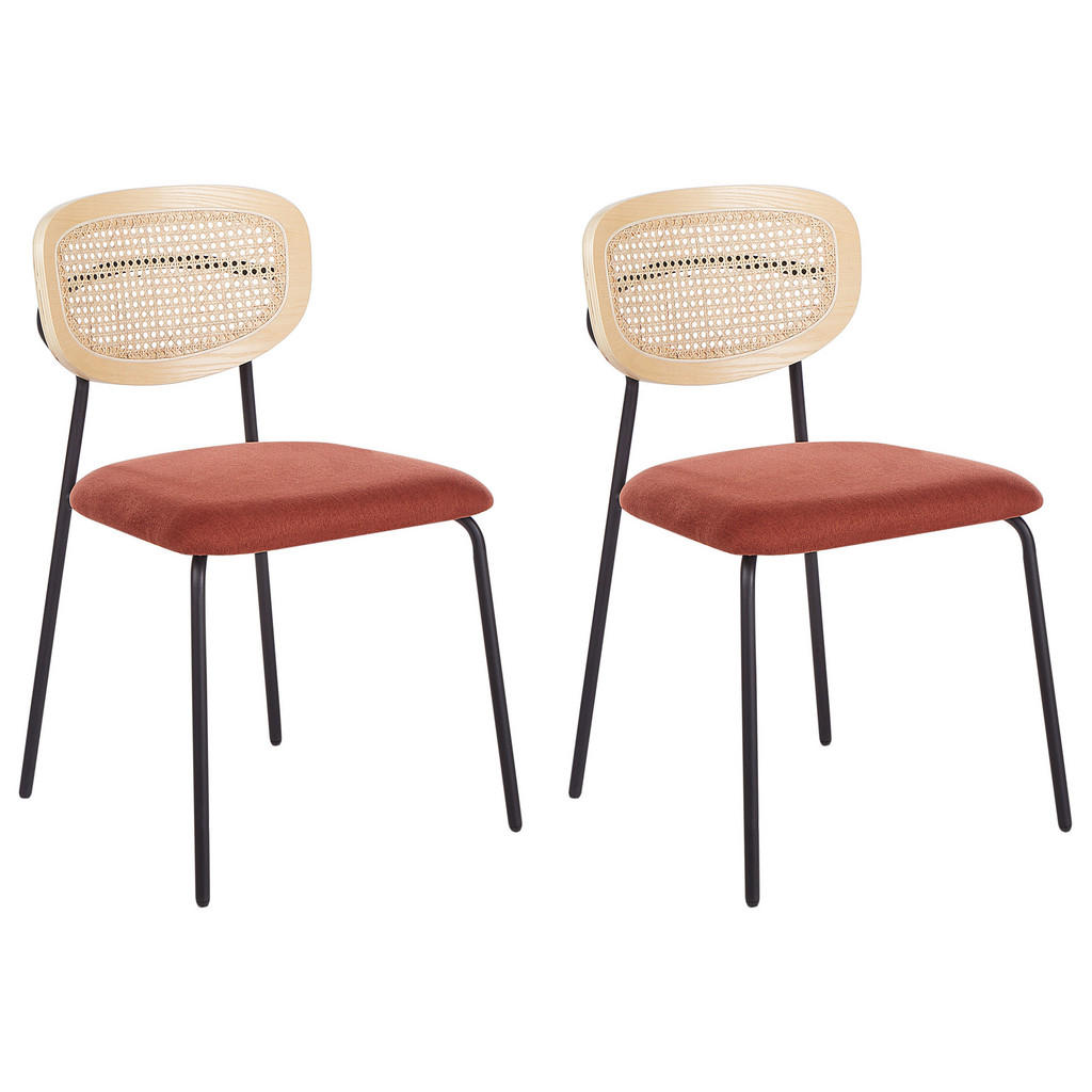 Gemütlicher Boho-Essstuhl mit Wiener-Geflecht-Lehne. Mit diesem Stuhlset können Sie ganz einfach den Look und die Atmosphäre Ihres Esszimmers oder Ihrer Küche aufwerten. Die Rückenlehnen sind aus hellem Rattan und Sperrholz gefertigt, was sie langlebig und pflegeleicht macht. Die Sitzfläche ist mit orangem Polyestergewebe gepolstert, während das Gestell aus schwarzem Eisen gefertigt ist, das der gesamten Konstruktion Stabilität verleiht. Das Gesamtdesign dieser Stühle lässt sich mit einer Vielzahl von Einrichtungsstilen kombinieren - von retro bis modern. Details: Typ: Esszimmerstuhl Stil: Retro Farbe: Natürlich, Orange, Schwarz Material Typ: Stoff Material: Polyester Zusätzliches Material: Eisen Gestellmaterial: Metall Sitzmaterial: Stoff Zusammenstellung: 100% Polyester Armlehnen: Nein Stapelbar: Nein Abmessungen: Tiefe: 51 cm Dicke der Polsterauflagen: 6 cm Sitzhöhe: 49 cm Breite: 50 cm Höhe: 81 cm Sitzfläche: 40x46 cm Gewicht: 6 kg Max. Belastung: 150 kg Sie kaufen: 2 x Barstuhl Produktvorteile: Geeignet für Küche, Esszimmer oder Bar, Breite, bequeme Sitzfläche, Zeitloses Design, Hochwertiges Polster, Schutzkappen zum Schutz des Bodens Montage: Beine / Füsse nicht montiert. 5 - 15 Min. Pflegehinweise: Polyester: 1. Flecken können mit einem Polsterreiniger, einem angefeuchteten Schwamm oder milden Reinigungsmitteln entfernt werden. 2. Oberflächen nur mit geeignetem Aufsatz vorsichtig absaugen. Eisen: 1. Bitte ausschließlich handelsübliche, milde Reinigungsmittel und weiche Tücher verwenden, wobei feuchte Stellen sofort trocken gerieben werden sol