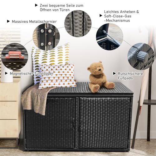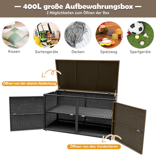 Beschreibung COSTWAY Auflagenbox Rattan, 333L, Kissenbox mit Doppeltüren & Deckel & Ablage, Gartenbox Truhenbank Sitzbank, Gartenbox wetterfest, für Terrasse Garten Balkon, 115/215x60x65cm (Schwarz)