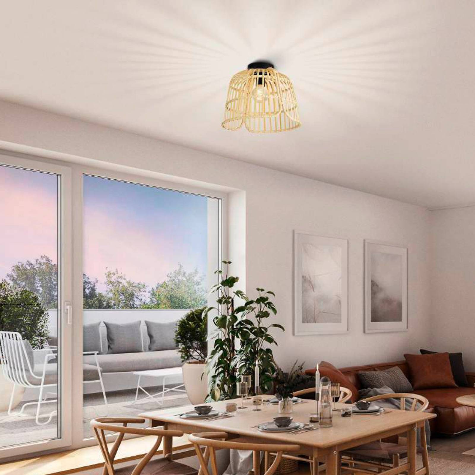 Der halbrunde Schirm der Deckenleuchte Glyneath ist nach unten geöffnet und lässt dank seiner geflochtenen Optik auch rundherum das Licht austreten. Der Schirm ist aus Rattan gefertigt und in seiner naturfarbenen Erscheinung belassen. Artikelnummer: 10012459Hersteller: EGLOMaterial: Stahl, HolzFarbe: schwarz, naturHöhe: 20.5 cmDurchmesser: 37.5 cmLeuchtmittel inklusive: NeinFassung: E27Leuchtmittel: 1 x 40 WDimmbar: JaSchutzklasse: ILeistungsaufnahme: 40Keywords: Holz-Deckenleuchte, Deckenlampe, Lampe
