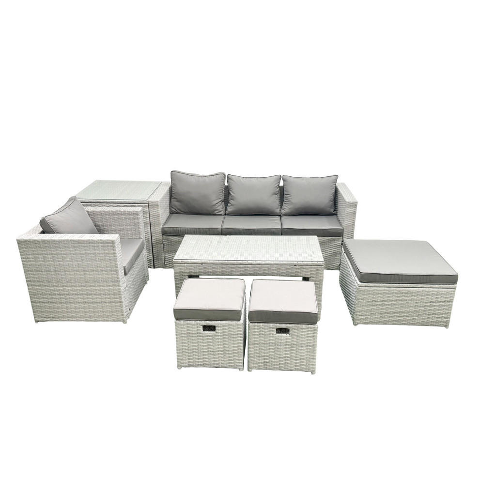 • Gartenmöbel Set Abmessungen: • 1 x Sofa mit doppelter Armlehne:177W x 65D x 66H cm • 1 x Lehnstuhl:74L x 65W x 66H CM • 1 x Beistelltisch:65L x 65W x 66H cm • 1 x Großer Hocker:65L x 65W x 34H cm • 2 x Vollständig montierte kleine Fußhocker:40W x 40D x 34H cm • 1 x Rechteckiger Couchtisch:105L x 50W x 48H cm Details: • Farbe:Hellgrau gemischt • Materialien:Polyrattan,Stoff,verzinkter Stahl,Schaum,Glas • Hergestellt aus hochwertigem PE-Rattan, handgeflochten • Stoffzusammensetzung Bezug:100% Polyester • pulverbeschichtetes Metallgestell • Wartungsarm, einfach zu reinigen • 8 CM dickes Sitzkissen,Abnehmbarer und waschbarer Sitzkissenbezug • Flache Packung • Kostenlose Rückgabe für Qualitätsprobleme innerhalb von 30 Tagen • Direktverkauf der Fabrik,Ein Jahr Garantie • Lieferung frei Bordsteinkante