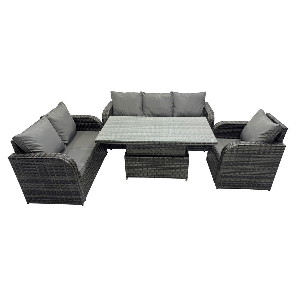 • Gartenmöbel Set Abmessungen: • 1 x Liegestuhl: 74L x 67W x 79H cm • 1 x Liebe Sofa:124Wx69Dx79H cm • 1 x 3-Sitzer Sofa:177W x 67D x 79H cm • 1 x höhenverstellbarer Esstisch:140L x 80W x 68/48H cm (Höhe oben 68, unten 48) Details: • der Esstisch ist höhenverstellbar von 48-68 cm • Farbe:Dunkelgrau gemischt • Materialien:Polyrattan,Stoff,verzinkter Stahl,Schaum,Glas • Hergestellt aus hochwertigem PE-Rattan, handgeflochten • Stoffzusammensetzung Bezug:100% Polyester • der Liegestuhl kann den Winkel 90-130 verstellen • pulverbeschichtetes Metallgestell • Wartungsarm, einfach zu reinigen • 8 CM dickes Sitzkissen,Abnehmbarer und waschbarer Sitzkissenbezug • Flache Packung • Kostenlose Rückgabe für Qualitätsprobleme innerhalb von 30 Tagen • Direktverkauf der Fabrik,Ein Jahr Garantie • Lieferung frei Bordsteinkante .
