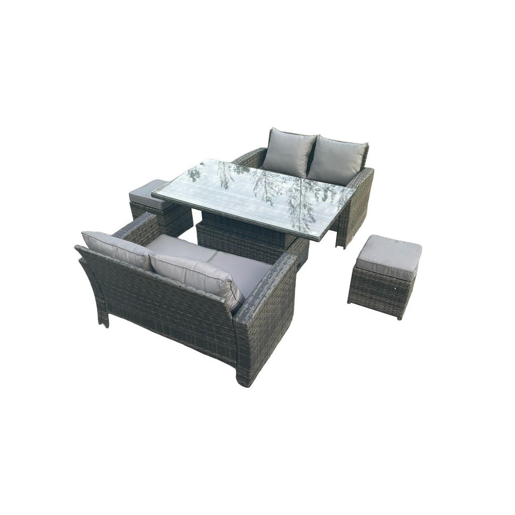 Set Abmessungen: • 1 x Einstellbare Höhe Esstisch: 140L x 80W x 68/48H cm (Höhe oben 68, unten 48) • 2 x Klein Vollständig montierter Fußschemel: 40L x 40W x 37H CM • 2 x 2-Sitzer Sofas: 124L x 70W x 74H CM Details: • Farbe:Dunkelgrau Gemischt • Materialien: Polyrattan,Stoff,verzinkter Stahl,Schaum,Glas • Hergestellt aus hochwertigem PE-Rattan, handgeflochten • Stoffzusammensetzung Bezug: 100% Polyester • pulverbeschichtetes Metallgestell • Wartungsarm, einfach zu reinigen • 8 CM dickes Sitzkissen,Abnehmbarer und waschbarer Sitzkissenbezug • Flache Packung • Kostenlose Rückgabe für Qualitätsprobleme innerhalb von 30 Tagen • Direktverkauf der Fabrik,Ein Jahr Garantie • Lieferung frei Bordsteinkante