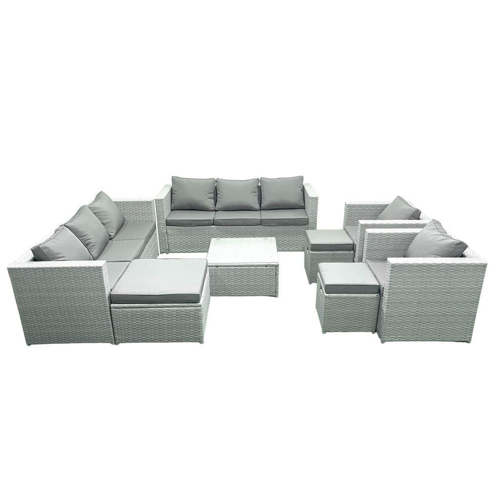 • Gartenmöbel Set Abmessungen: • 2 x Sofa mit doppelter Armlehne:177W x 65D x 66H cm • 2 x Lehnstuhl:74L x 65W x 66H CM • 1 x Großer Hocker:65L x 65W x 34H cm • 2 x Vollständig montierte kleine Fußhocker:40W x 40D x 34H cm • 1 x Quadratischer Couchtisch:65L x 65W x 34H cm Details: • Farbe:Hellgrau gemischt • Materialien:Polyrattan,Stoff,verzinkter Stahl,Schaum,Glas • Hergestellt aus hochwertigem PE-Rattan, handgeflochten • Stoffzusammensetzung Bezug:100% Polyester • pulverbeschichtetes Metallgestell • Wartungsarm, einfach zu reinigen • 8 CM dickes Sitzkissen,Abnehmbarer und waschbarer Sitzkissenbezug • Flache Packung • Kostenlose Rückgabe für Qualitätsprobleme innerhalb von 30 Tagen • Direktverkauf der Fabrik,Ein Jahr Garantie • Lieferung frei Bordsteinkante