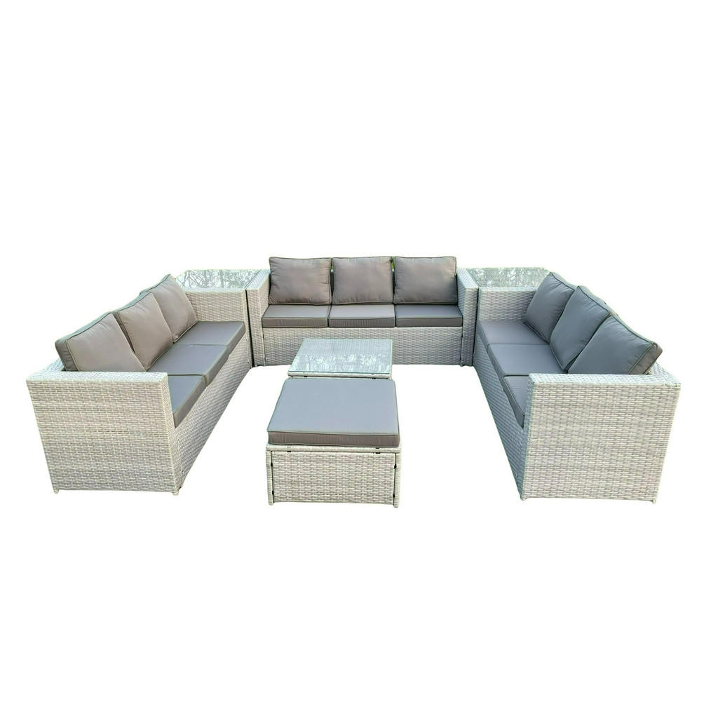 Set Abmessungen: • 3 x 3 Sitzer Sofa: 177L x 65D x 66H CM • 1 x quadratischer Couchtisch:65L x 65W x 34H CM • 2 x Beistelltisch:65L x 65W x 66H cm (ohne Staufunktion) • 1 x großer Hocker: 65L x 65W x 34H cm Details: • Farbe:Hellgrau gemischt • Materialien: Polyrattan,Stoff,verzinkter Stahl,Schaum,Glas • Stoffzusammensetzung Bezug: 100% Polyester • pulverbeschichtetes Metallgestell • Wartungsarm, einfach zu reinigen • 8 CM dickes Sitzkissen,Abnehmbarer und waschbarer Sitzkissenbezug • Flache Packung • Kostenlose Rückgabe für Qualitätsprobleme innerhalb von 30 Tagen • Direktverkauf der Fabrik,Ein Jahr Garantie • Lieferung frei Bordsteinkante