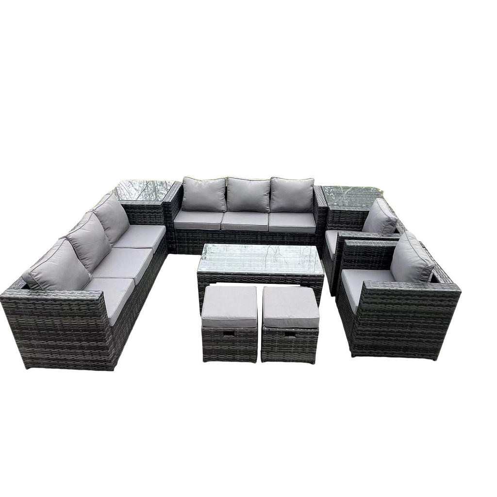 Set Abmessungen: 2 x Doppelarmlehne Sofa Größe: 176W x 65D x 66H cm 1 x Couchtisch Größe: 105L x 50W x 48H cm 2 x Beistelltisch:65W x65D x66H cm 2 x Stühle:74W x65D x66H cm 2 x Voll montierte Hocker:40W x40D x34H cm • Farbe:Dunkelgrau gemischt • Materialien: Polyrattan,Stoff,verzinkter Stahl,Schaum,Glas • Stoffzusammensetzung Bezug: 100% Polyester • pulverbeschichtetes Metallgestell • Wartungsarm, einfach zu reinigen • 8 CM dickes Sitzkissen,Abnehmbarer und waschbarer Sitzkissenbezug • Flache Packung • 30-Tage kostenlose Rückkehr. • Direktverkauf der Fabrik,Ein Jahr Garantie • Lieferung frei Bordsteinkante