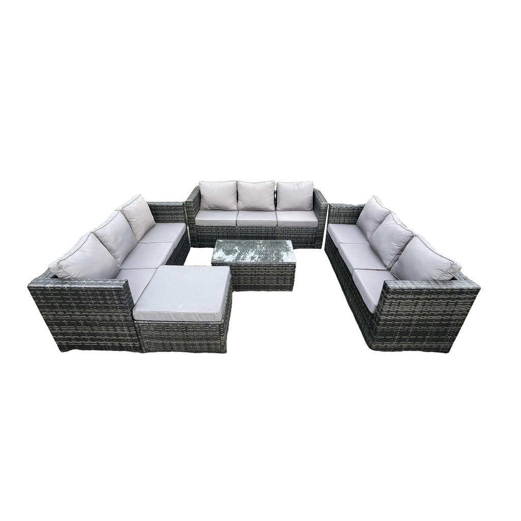 Abmessungen festlegen: • 3 x Dreisitzer Sofa: 177W x 65D x 66H cm • 1 x Oblong Tischgröße: 85L x 50W x 37H cm • 1 x Big Hocker Größe: 65L x 65W x 35H cm • Sofa Gewicht Kapazität: 250kg • Tischgewicht Kapazität: 80kg Details: • Farbe:Dunkelgrau gemischt • Materialien: Polyrattan,Stoff,verzinkter Stahl,Schaum,Glas • Stoffzusammensetzung Bezug: 100% Polyester • pulverbeschichtetes Metallgestell • Wartungsarm, einfach zu reinigen • 8 CM dickes Sitzkissen,Abnehmbarer und waschbarer Sitzkissenbezug • Flache Packung • Kostenlose Rückgabe für Qualitätsprobleme innerhalb von 30 Tagen • Direktverkauf der Fabrik,Ein Jahr Garantie • Lieferung frei Bordsteinkante
