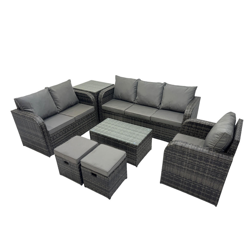 Gartenmöbel Set Abmessungen: • 1 x Beistelltisch:65L x 65W x 66H cm • 2 x Vollständig montierte kleine Fußhocker:40L x 40w x 34H cm • 1 x Liegestuhl:74L x 67W x 79H cm • 1 x Liebe Sofa:124W x 67D x 79H cm • 1 x 3-Sitzer Sofa:177W x 67D x 79H cm • 1 x Rechteckiger Couchtisch:85L x 50W x 37H cm Details: • Farbe:Dunkelgrau gemischt • Materialien:Polyrattan,Stoff,verzinkter Stahl,Schaum,Glas • Hergestellt aus hochwertigem PE-Rattan, handgeflochten • Stoffzusammensetzung Bezug:100% Polyester • der Liegestuhl kann den Winkel 90-130 verstellen • pulverbeschichtetes Metallgestell • Wartungsarm, einfach zu reinigen • 8 CM dickes Sitzkissen,Abnehmbarer und waschbarer Sitzkissenbezug • Flache Packung • Kostenlose Rückgabe für Qualitätsprobleme innerhalb von 30 Tagen • Direktverkauf der Fabrik,Ein Jahr Garantie • Lieferung frei Bordsteinkante