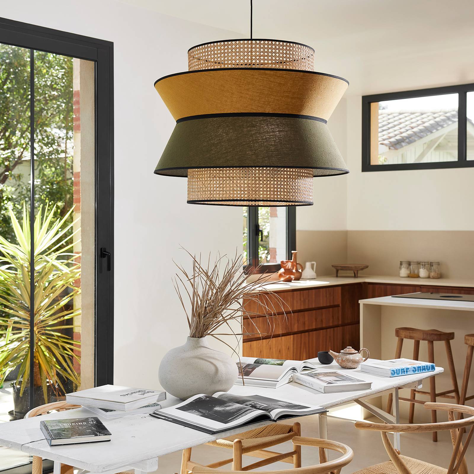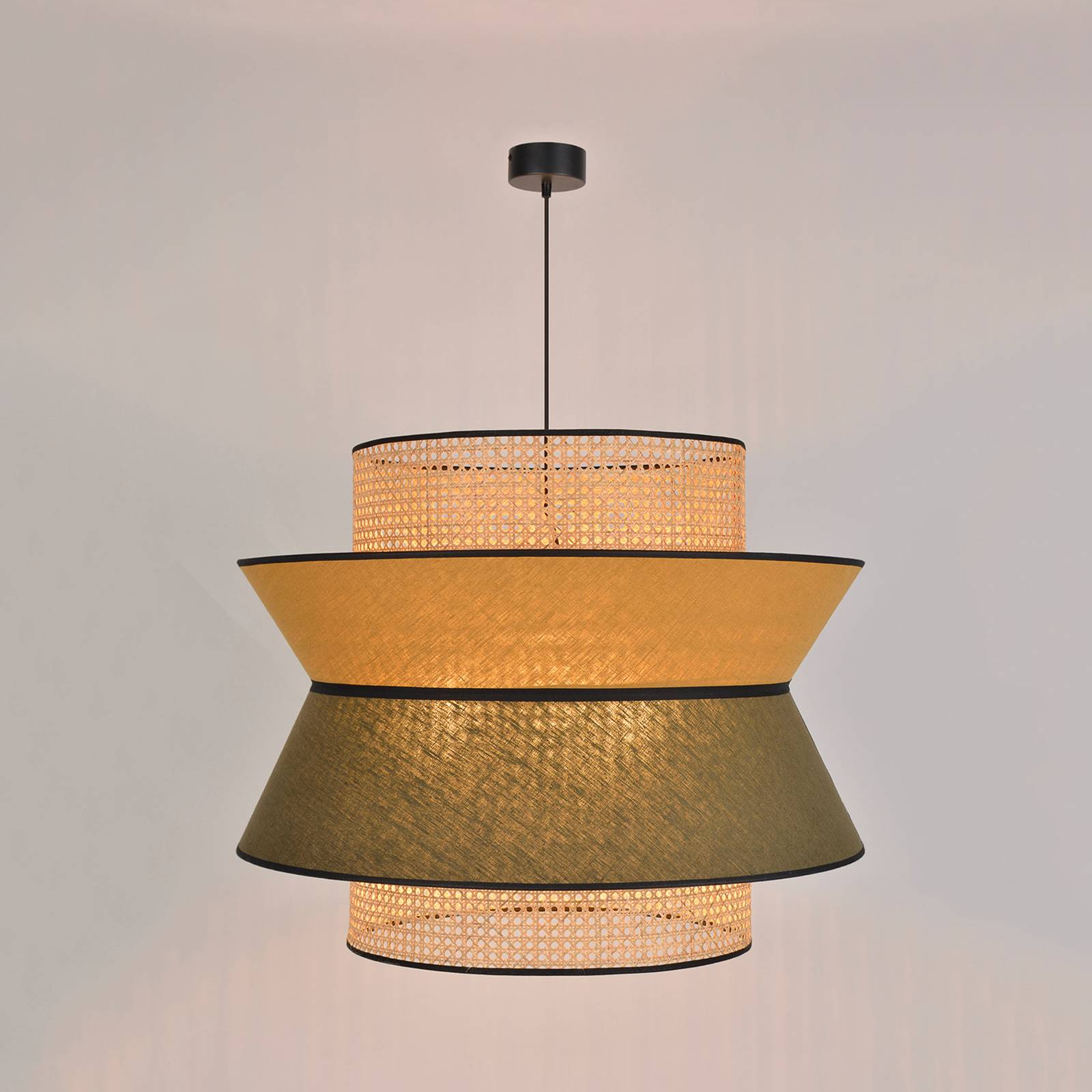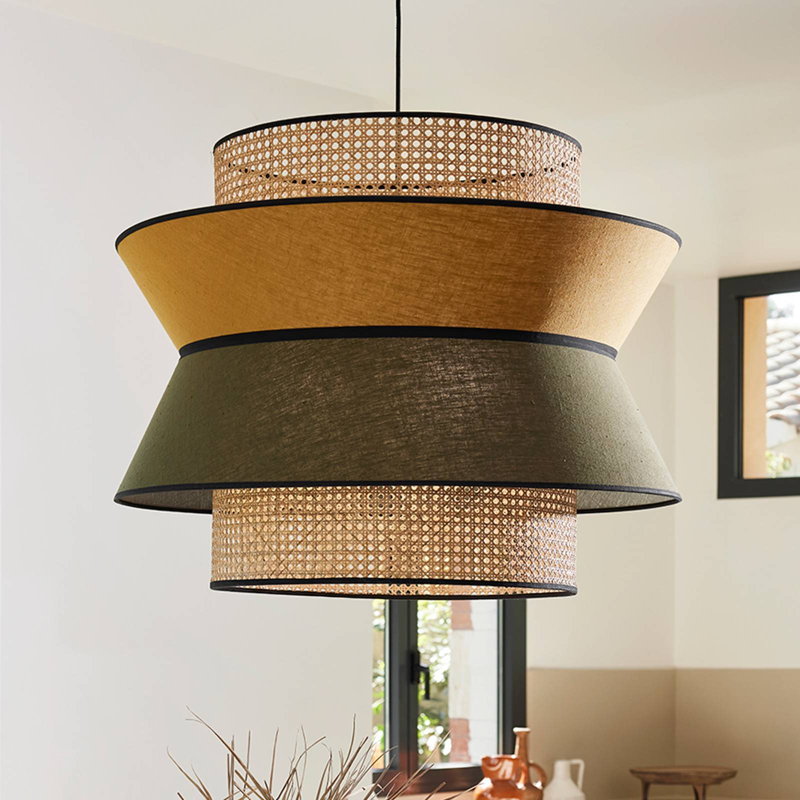 Die Hängeleuchte Singapour XXL ist mit einem Schirm aus Rattangeflecht bestückt, über dem noch zwei miteinander verbundene Schirme aus Leinen in unterschiedlichen Farbtönen sitzen. Eingeschaltet entsteht eine tolle Lichtwirkung, da sich das Rattanmuster unter dem Leinenstoff abzeichnet. - mit Textilkabel bestückt - extern dimmbar - Design aus Frankreich: MARKET SET Artikelnummer: 10010903Hersteller: MARKET SETMaterial: Textil, Rattan, MetallFarbe: khaki, curry, holz hell, schwarzHöhe: 60 cmDurchmesser: 78 cmAbhängung: 330 cmSonstige Maße: Baldachin - Ø 10 cm, Höhe 4 cmLeuchtmittel inklusive: NeinFassung: E27Leuchtmittel: 3 x 40 WDimmbar: JaSchutzklasse: IIAusführung: FARBELeistungsaufnahme: 40Style: DesignKeywords: Design-Hängeleuchte, Hängelampe, Lampe, Deckenleuchte, Deckenlampe, Hängeleuchte