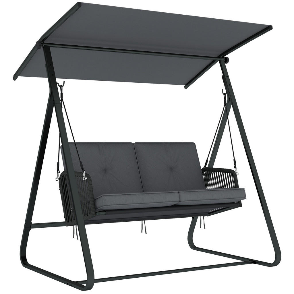 Die Rattan-Schaukel ist Ihr freistehendes Refugium – einsatzbereit ohne umständliche Montage. Grelle Sonne oder unbequeme Sitzgelegenheiten können kostbare Momente im Freien trüben. Mit der Outsunny Hollywoodschaukel genießen Sie weiche Kissen zu zweit. Verstellen Sie das Dach für idealen Schatten und schaffen Sie eine idyllische Ecke in Ihrem Garten oder auf Ihrer Terrasse mit dieser stilvollen Schaukel. Beschreibung: ● Genießen Sie gemütliche Entspannung auf dieser Rattan-Schaukel mit zwei dicken Sitzkissen; ● Das große, verstellbare Dach dieser Hollywoodschaukel bietet jederzeit viel Schatten vor der Sonne; ● Ein robuster, pulverbeschichteter Stahlrahmen trägt sicher bis zu 240 kg; ● Geflochtenes PE-Rattan bietet zuverlässigen, stilvollen Halt; ● Doppelseile und vier Sicherheitsschnallen sorgen für Stabilität der Terrassenschaukel; ● Montage erforderlich; Technische Daten: ● Farbe: Dunkelgrau; ● Material: PE-Rattan, Stahl; ● Gesamtabmessungen: 150B x 128T x 168H cm; ● Dachgröße: 144B x 115T cm; ● Sitzgröße: 110B x 52T x 44H cm; ● Rückengröße: 110B x 42H cm; ● Armlehnenbreite: 2,5 cm; ● Polsterdicke: 7 cm; ● Belastbarkeit: 240 kg; Lieferumfang: ● 1 x Rattan-Schaukelstuhl; ● 2 x Kissen; ● 1 x Anleitung;