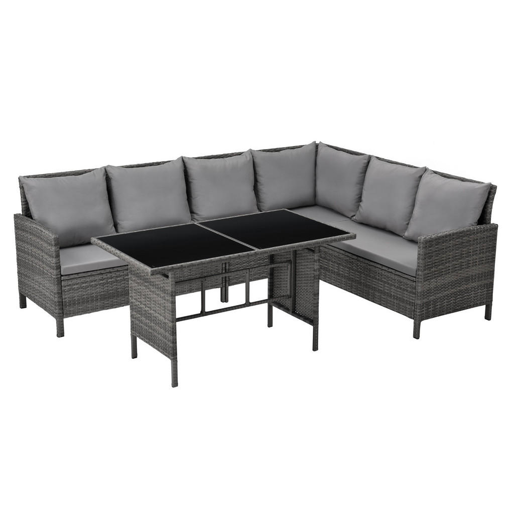 Svita Madison Essgruppe - Gemütliche Garten-Lounge für entspannte Stunden - Durch seine praktische Form ist das Rattan-Set für jeden Outdoor-Bereich, wie beispielsweise den Garten, die Terrasse oder für einen geräumigen Balkon bestens geeignet. Das Polyrattan-Geflecht ist wetterfest, UV-lichtbeständig, schmutzabweisend und leicht zu reinigen. Handlich durch ihr geringes Gewicht, lässt sich die Lounge Garnitur leicht umstellen und transportieren. Ausgestattet mit kuschligen, dicken Kissen und großzügig gepolsterten Sitzflächen, bietet die Svita Essgruppe Madison viel Platz, Gemütlichkeit und hohen Sitz-Komfort. Alle Kissenbezüge sind abnehmbar und waschbar. Produktdetails: Ecksofa: ca. 167 x 233 x 80 cm (BxTxH) Sitzhöhe: ca. 35 cm (ohne Kissen) Sitztiefe: ca. 58 cm Tisch: ca. 66 x 120 x 66 cm (BxTxH) Glasplatten: ca. 5 mm stark Material: Kunststoffgeflecht - wasserabweisend Pulverbeschichteter Stahlrahmen Farbe Polyrattan: Grau Farbe Kissen: Grau Lieferumfang: 1x Madison Lounge 1x Aufbauanleitung Neu und originalverpackt - Schnell und zuverlässig nach Hause geliefert