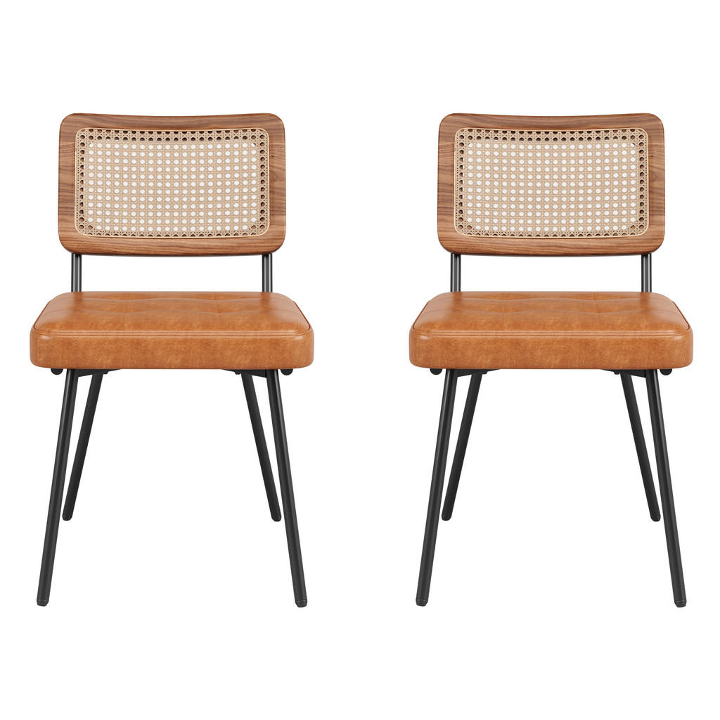 2er-Set Esszimmerstühle – PU-Leder & Rattan, zeitloser Komfort Dieses Stuhl-Duo vereint wohnlichen Retro-Charme mit moderner Funktion. Eine weich gepolsterte Sitzfläche in wasserabweisendem PU-Leder (Cognac) trifft auf eine belüftete Rückenlehne aus Holzrahmen mit Rattan-Geflecht. Pulverbeschichtete, schwarze Metallbeine mit verstellbaren Standfüßen sorgen für einen sicheren Stand – auch auf leicht unebenen Böden. Highlights Bequem sitzen: dicke Polsterung mit hochelastischem Schaumstoff (ca. 6,5 cm) Ergonomische Lehne: sanfte Unterstützung für Nacken, Rücken & Lenden Pflegeleicht: wasserabweisender PU-Bezug – einfach feucht abwischen Stabil & standsicher: Metallbeine, höhenjustierbare Füße, bis 150 kg je Stuhl Vielseitig kombinierbar: ideal für Esszimmer, Küche oder als Akzentstuhl Material & Farbe Sitz: PU-Leder (Cognac), atmungsaktive Polsterung Rückenlehne: Holzrahmen mit PE-Rattan-Geflecht (natur) Gestell: Metall, pulverbeschichtet (schwarz) Maße & Belastbarkeit (je Stuhl, ca.) Gesamtbreite × -tiefe × -höhe 61 × 44 × 79 cm Sitzbreite × -tiefe 46 × 38 cm Sitzhöhe 41 cm Lehnenmaß (sichtbarer Geflechtbereich) ca. 43 × 27,5 cm Polsterdicke ca. 6,5 cm Max. Belastbarkeit 150 kg Lieferumfa