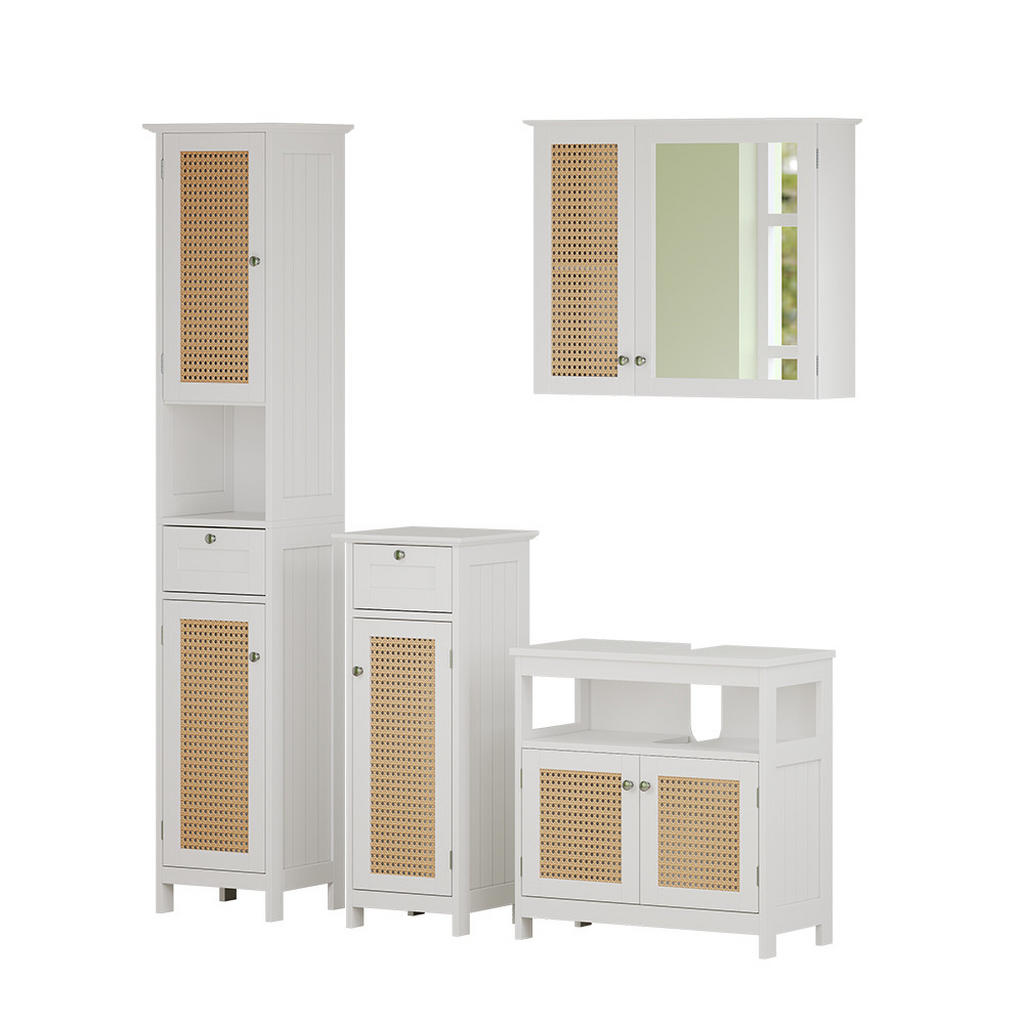 Das Vicco Badmöbel-Set Rosario in Weiß mit dekorativer Front. Stilvoller Stauraum im Badezimmer - inklusive Spiegelschrank, Hochschrank, Waschtischunterschrank und Midischrank. Das einzigartige Türdekor mit dem kunstvollen Rattangeflecht im Lochmuster verleiht Ihrem Badezimmer eine unvergleichliche Ästhetik. Es beschert Ihrem Badezimmer einen besonderen Charme. MAßE: Badezimmer-Set besteht aus 4 Teilen. Die detaillierten Größen sind auf den Fotos angegeben. Material: Die Badezimmermöbel überzeugen mit einem stabilen Korpus aus 15 mm Mdf. Edle Metallgriffe setzen Akzente. Die pflegeleichte Oberfläche garantiert lange Schönheit ohne großen Aufwand Lieferumfang: Das Badmöbel-Set wird inklusive Montagematerial und -anleitung geliefert. Die unkomplizierte Aufstellung lässt Sie die stilvolle Ergänzung für Ihr Badezimmer schnell genießen.